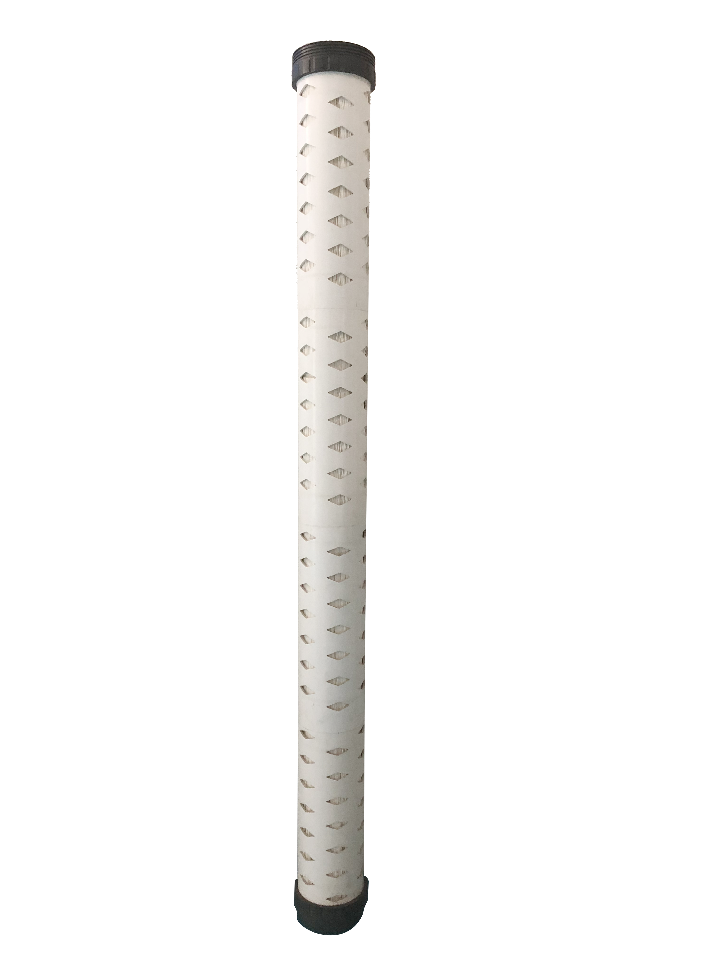菱形镂空结构,横宽纵窄,同开放面积下,径向膜丝断丝风险低;且尺寸由底座端至上端盖处呈渐进式放大设计,曝气逸散更加均匀,下部菱形孔小,便于底部曝气集中,上端菱形孔大,便于污染物排出膜外;